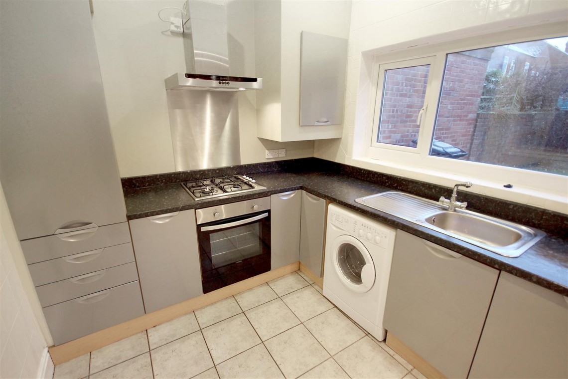 Generously proportioned modern kitchen fitted with a range of wall and base units with a contrasting granite effect worktop. Having integrated fridge and freezer, stainless steel sink and drainer, fan assisted oven with 4 ring gas hob above, illuminated extraction unit, under counter washing machine, cupboard housing the Baxi combination boiler, tiled flooring, gas central heating radiator, side and rear facing UPVC double glazed windows and side facing timber glazed external door.