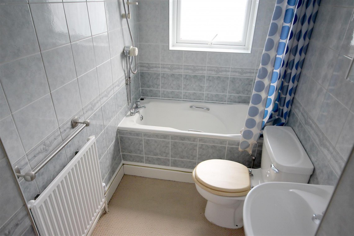 Well appointed fully tiled bathroom having panelled bath with thermostatic shower above, WC, pedestal wash basin, rear facing UPVC double glazed window, carpeted flooring and gas central heating radiator.