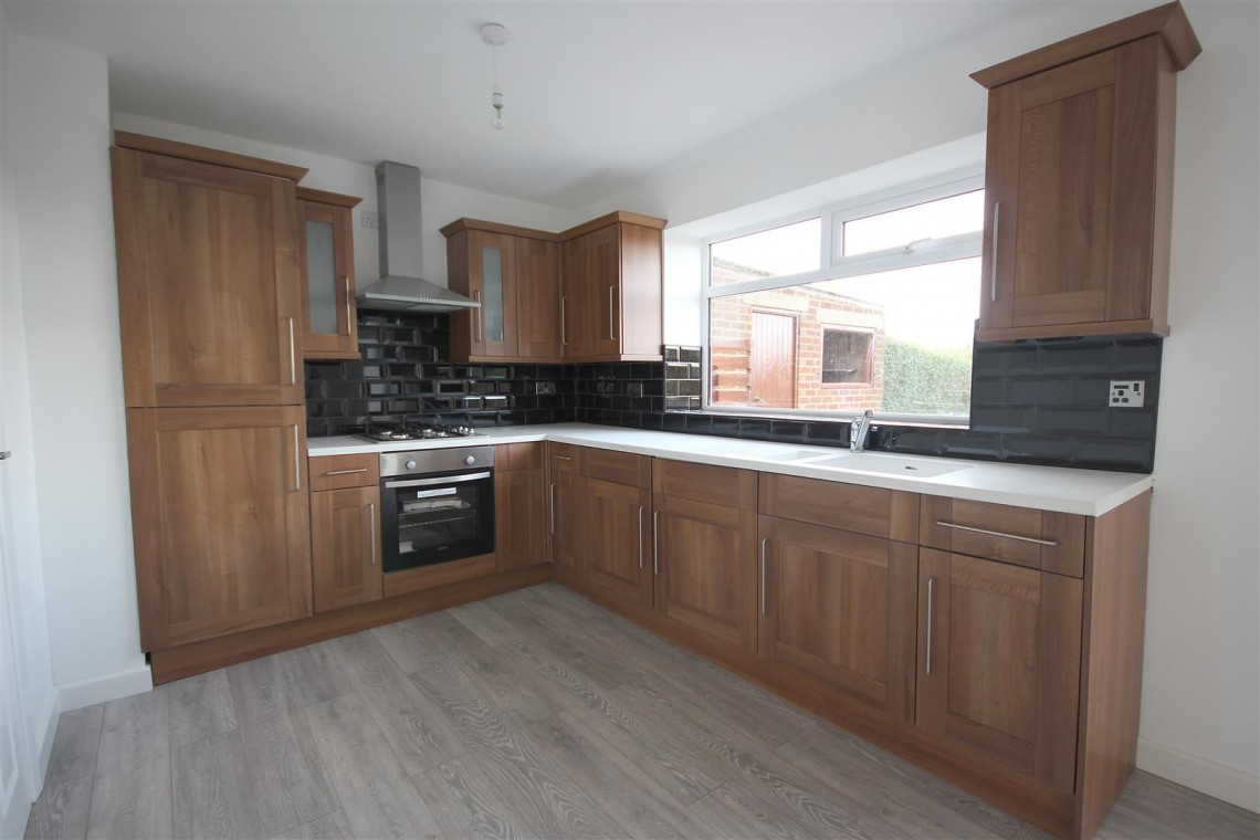 Newly fitted modern styled kitchen fitted with a range of newly installed cabinets with contrasting stone effect counter top. Benefiting from inset one and half bowl sink and drainer, 4 ring gas hob with stainless steel extractor above and fan assisted oven below. Also having integrated fridge/freezer, wood effect laminate flooring, rear facing UPVC double glazed window and rear facing glazed french UPVC doors opening to the garden.