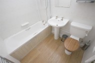 Good sized with a white 3 piece suite comprising of WC, pedestal wash basin, and white panelled bath with shower over (no bath function). Also having fully tiled walls, heated towel rail, mirrored wall unit and laminate flooring.