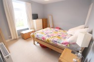 Large master bedroom having front facing UPVC double glazed window, carpeted flooring, gas central heating radiator and built-in storage cupboard with hanging rail.