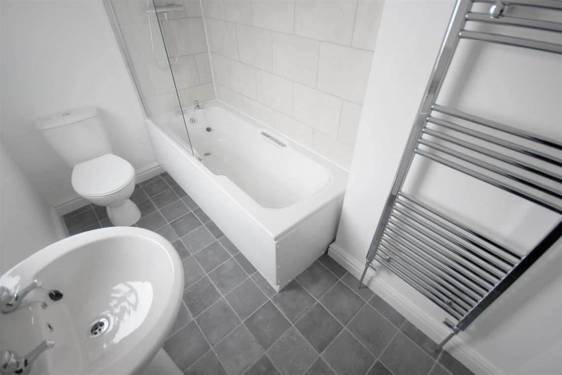 Well presented and good sized bathroom fitted with white suite comprising: bath with shower over and tiled splash backs, WC and pedestal wash hand basin. Also benefiting from cushioned flooring and chrome heated towel rail.