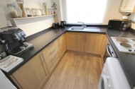 Modern kitchen benefiting from a range of wall and base units with contrasting worktops. Having 4 ring electric hob with extractor above and electric oven below, stainless steel sink, washer/dryer and freestanding fridge/freezer. Also having front facing UPVC double glazed window, cushioned flooring and storage cupboard containing electric emersion heater.