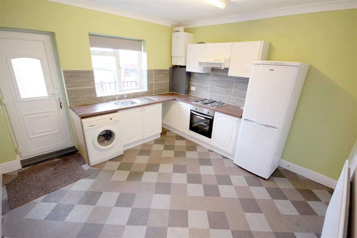 Good sized rear facing dining kitchen fitted with a good range of wall and base units with work surface incorporating stainless steel sink with mixer tap and drainer. Benefiting from four burner gas hob with oven beneath and extractor above, 70/30 split fridge and freezer and washing machine. Also having tiled splash backs, cushioned flooring, rear facing UPVC window and door and gas central heating radiator. Also housing the boiler.