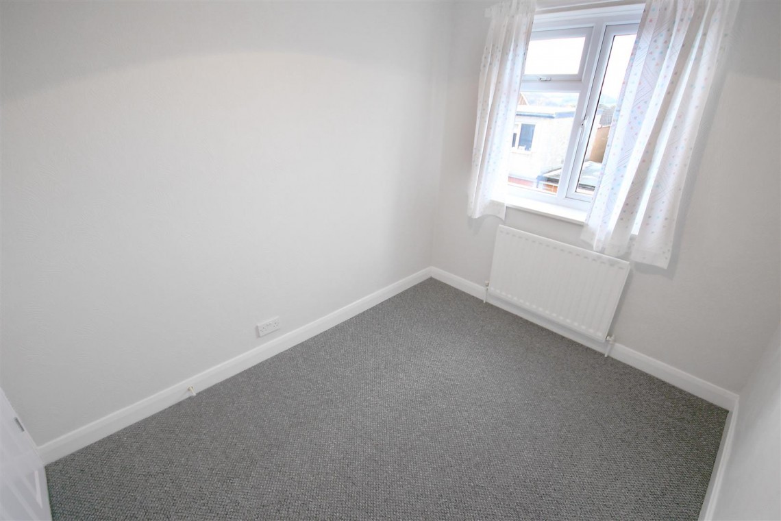 Rear facing bedroom having UPVC double glazed window, gas central heating radiator and carpeted flooring.